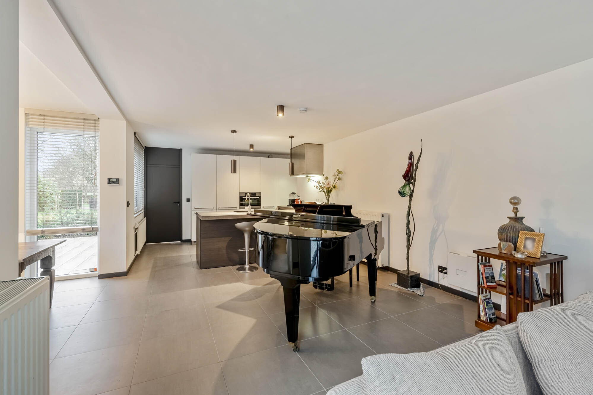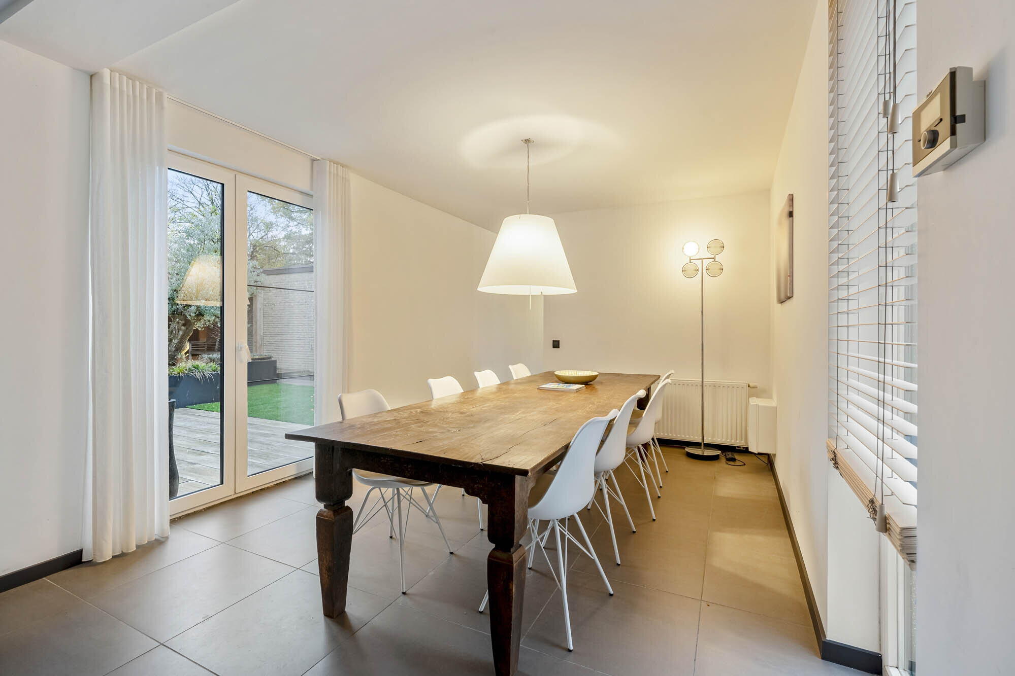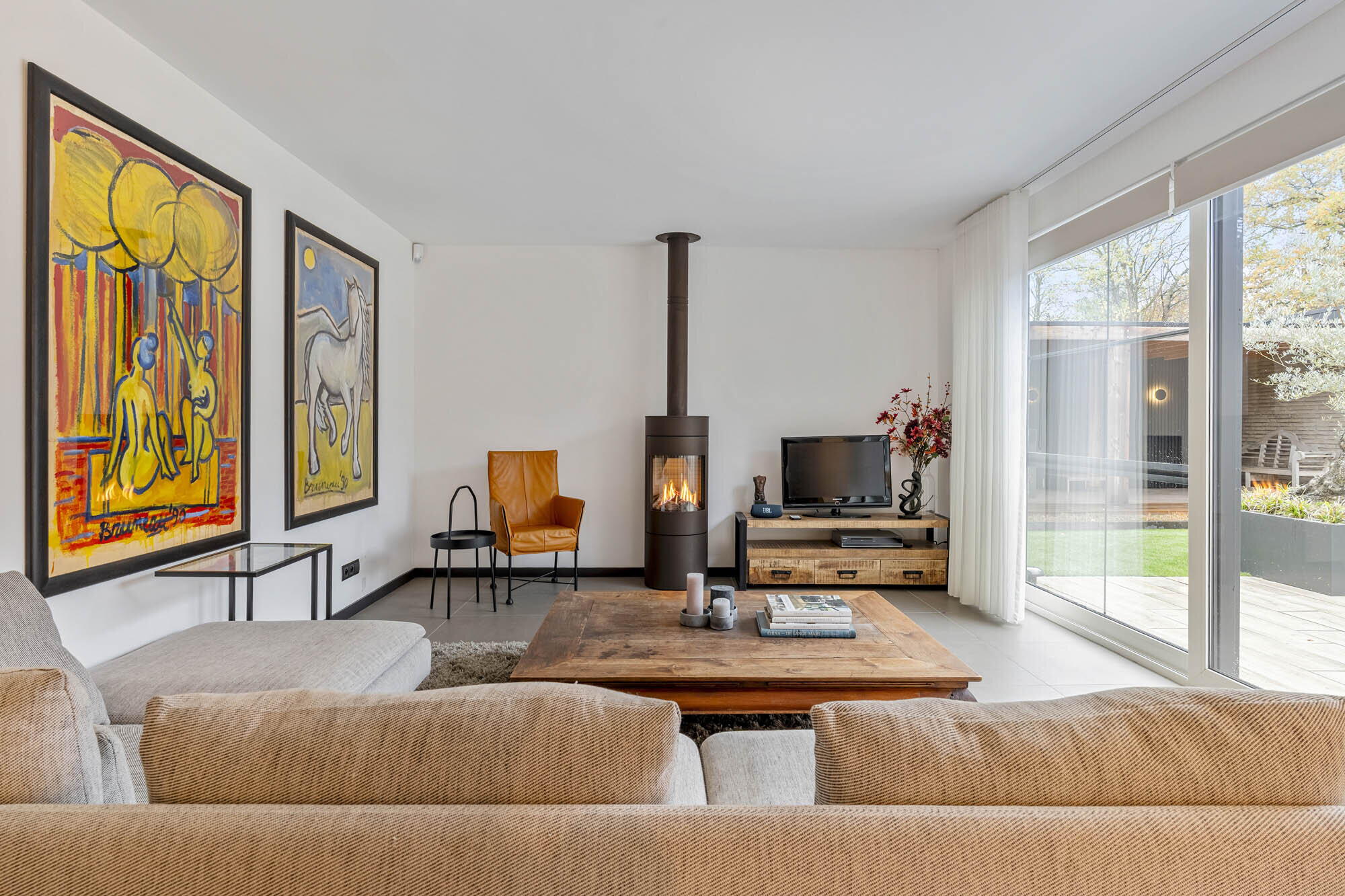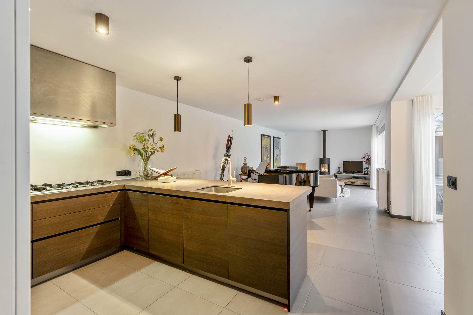 - Woonkamer en eetkamer voorzien van een prachtige sfeervolle designhaard (RAIS Attika - Dalemans Maasmechelen 2023), schuifraam dat toegang geeft tot de binnentuin;