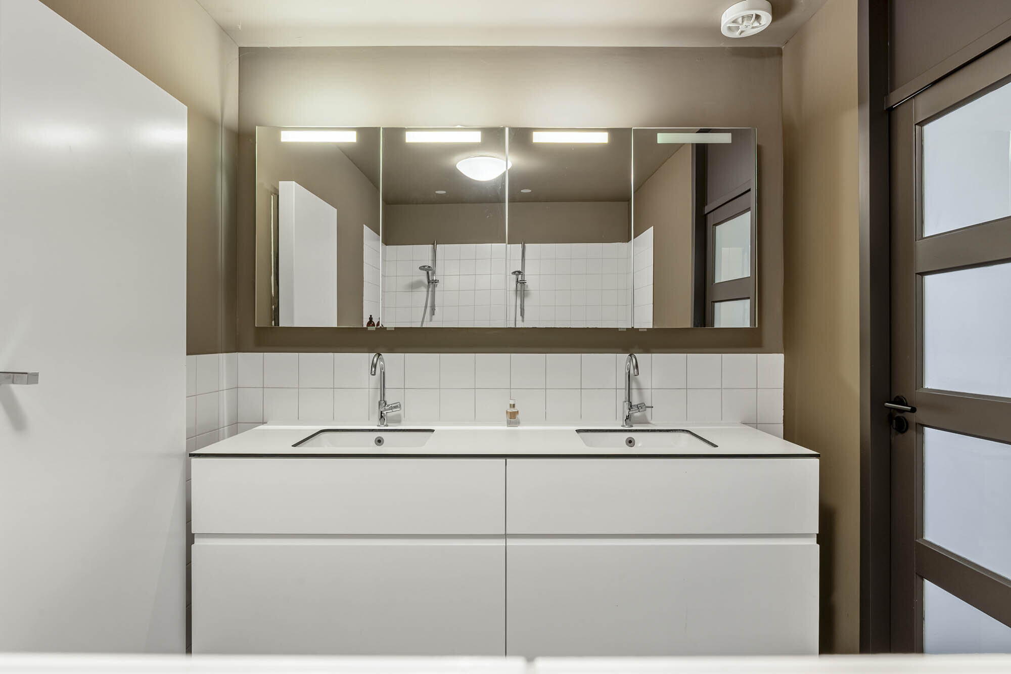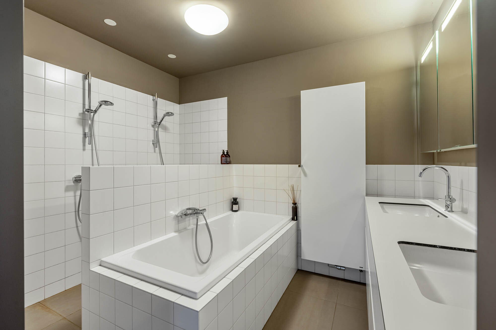 - Badkamer met ligbad, dubbele wastafel met onderkasten, spiegelkast, designradiator en een riante inloopdouche met 2 regendouches (Gröhe);