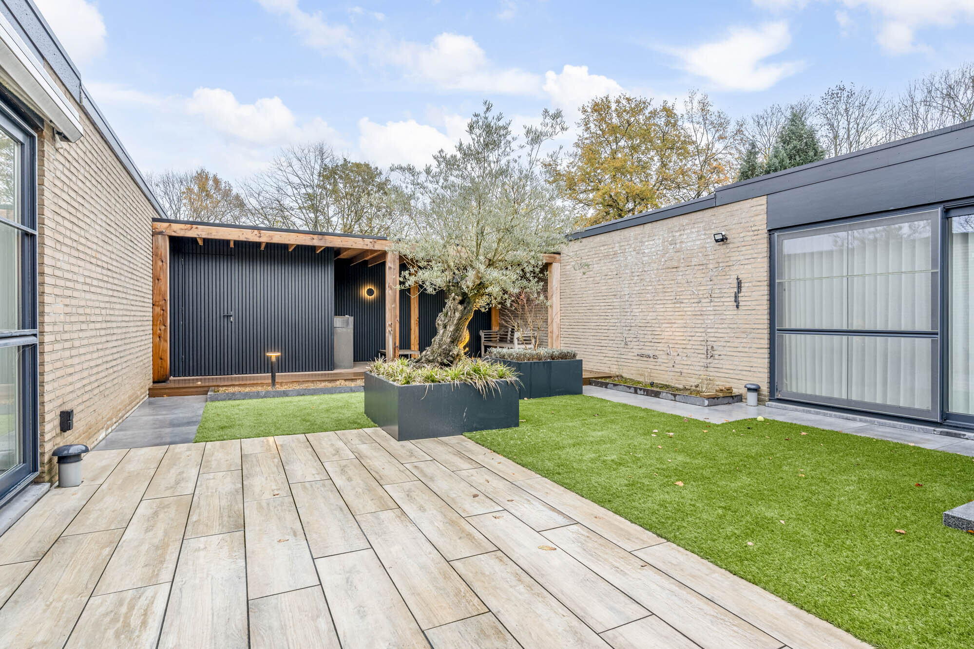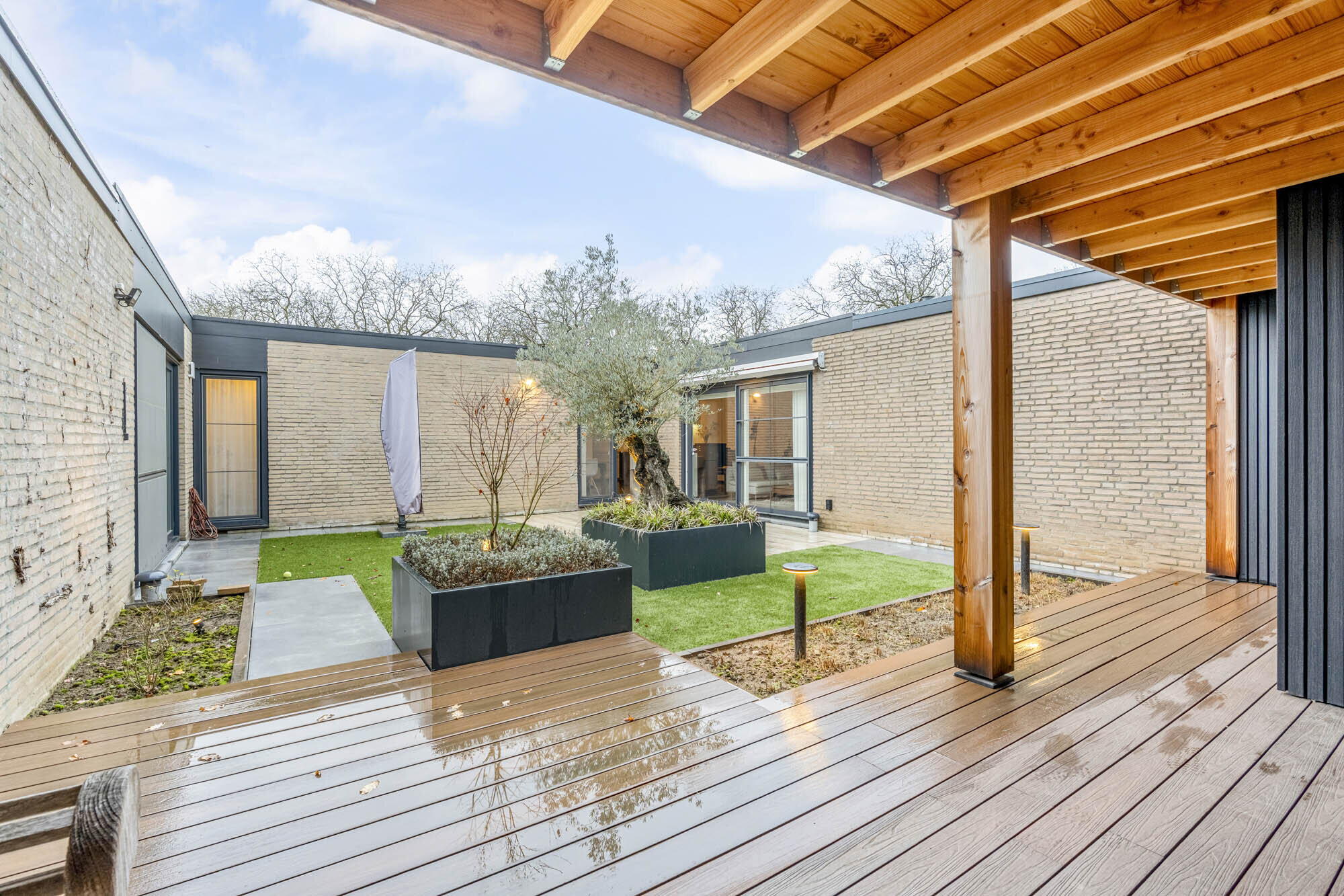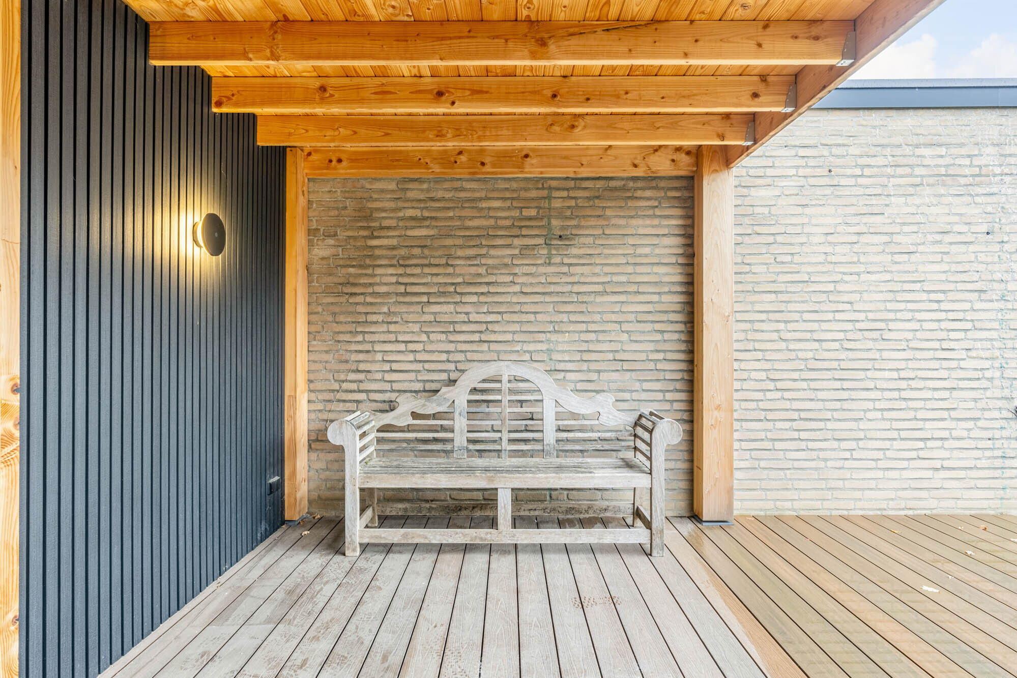 - Overdekt terras met afsluitbare buitenberging van hout en composieten planken (onderhoudsvriendelijk!);
